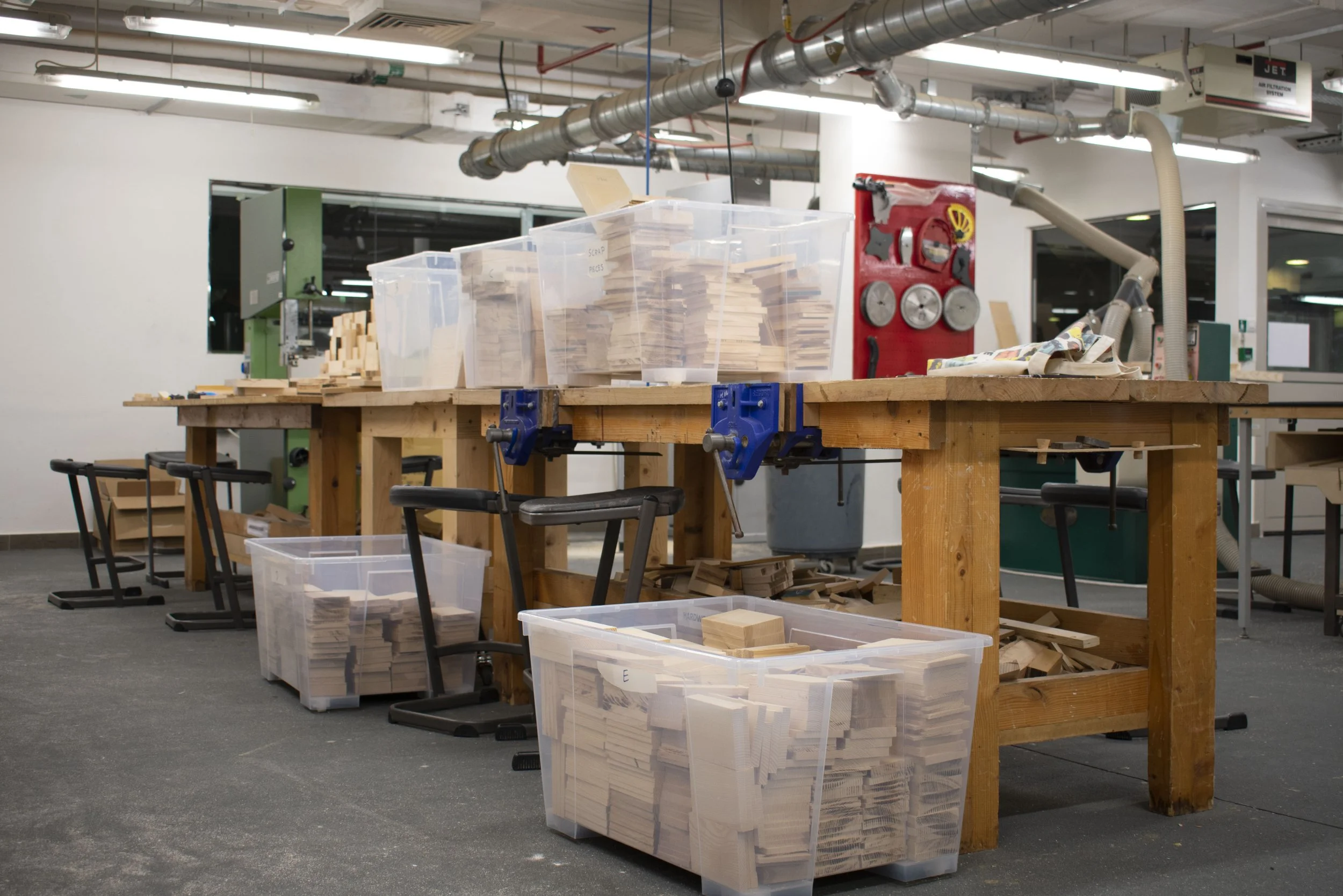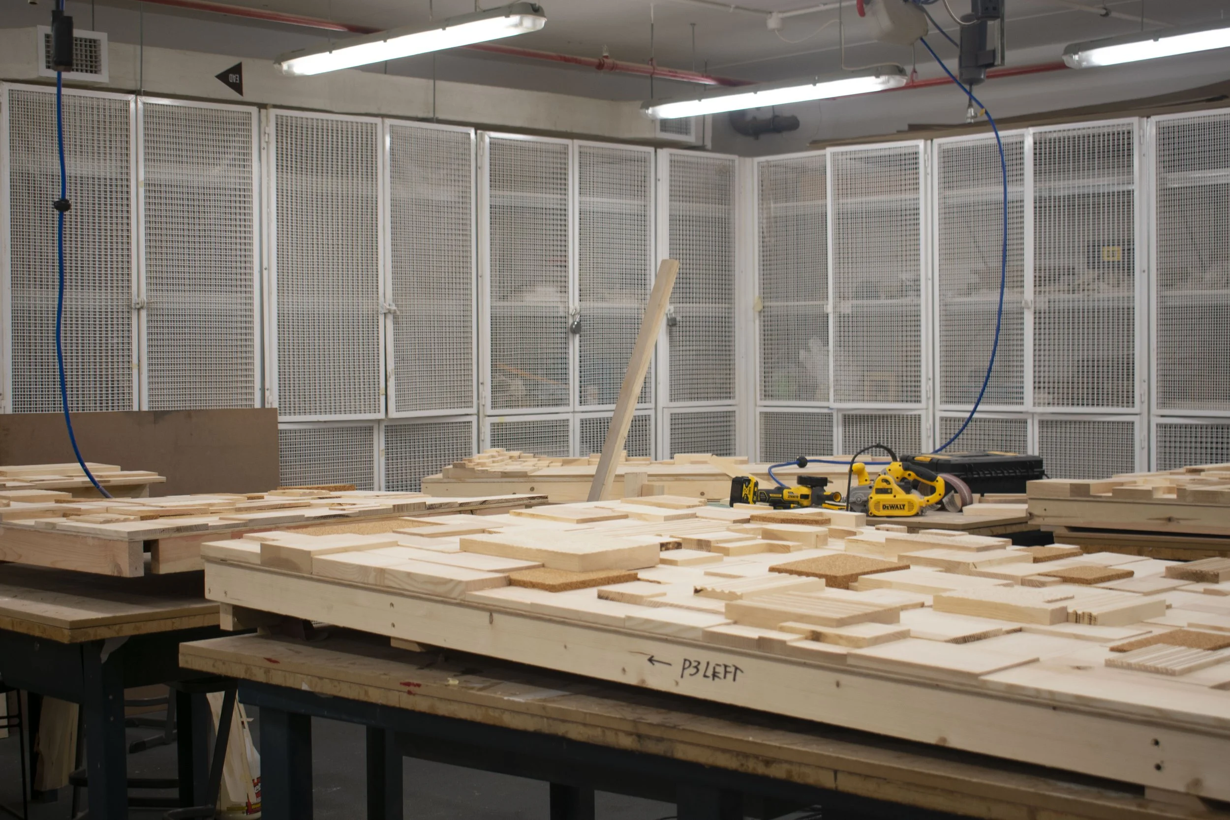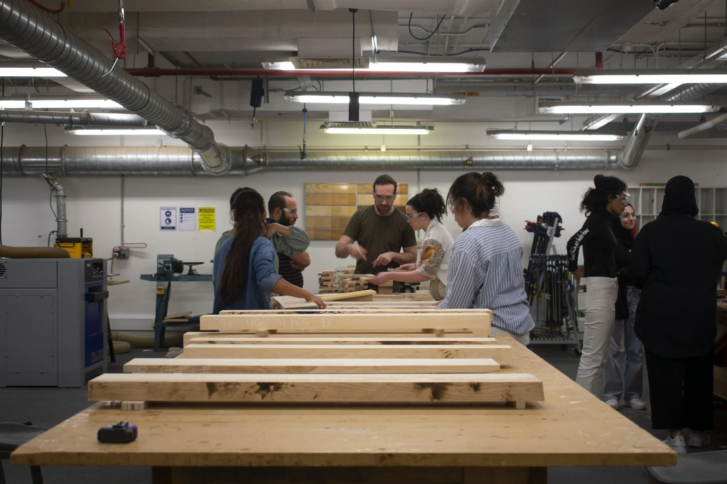 Process photographs documenting the collective making of a CAAD student lounge designed for both work and leisure.
